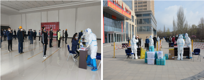 在疫情防控紧要时期,主动配合落实核酸检测等防控措施。多频次联系大通县疫情防控指挥部及北川园区管委会,于4月14日、4月17日开展两轮核酸检测行动。为做好本次核酸检测工作,公司党政领导班子高度重视,科学谋划,与相关单位沟通衔接后,连夜加班在园区空旷区域设置检测点,方便核酸检测工作;同时根据公司生产经营实际,公司财务审计部、实业开发部人员、供销部负责同志协同公司所属各单位,密排人员在岗、离岗、休班情况,提前编制完成人员信息统计及分组排序表;历经全员密切配合,两次共采集核酸检测样本2093个,保证了筛查应检尽检、无一遗漏,及时排除风险。